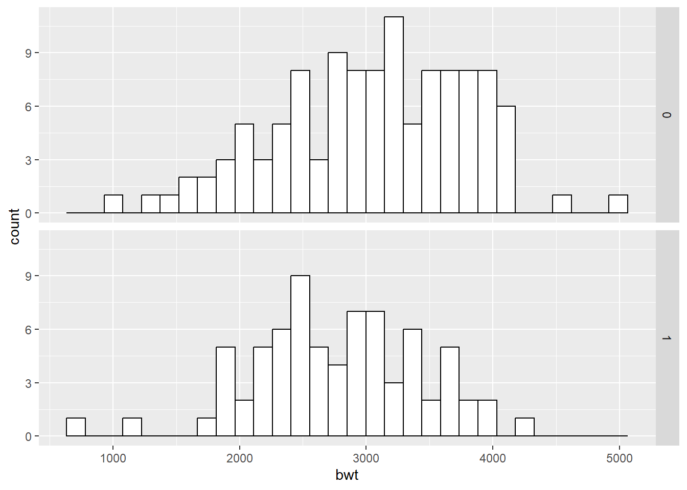facet_grid(smoke ~. )`stat_bin()` using `bins = 30`. Pick better value `binwidth`.