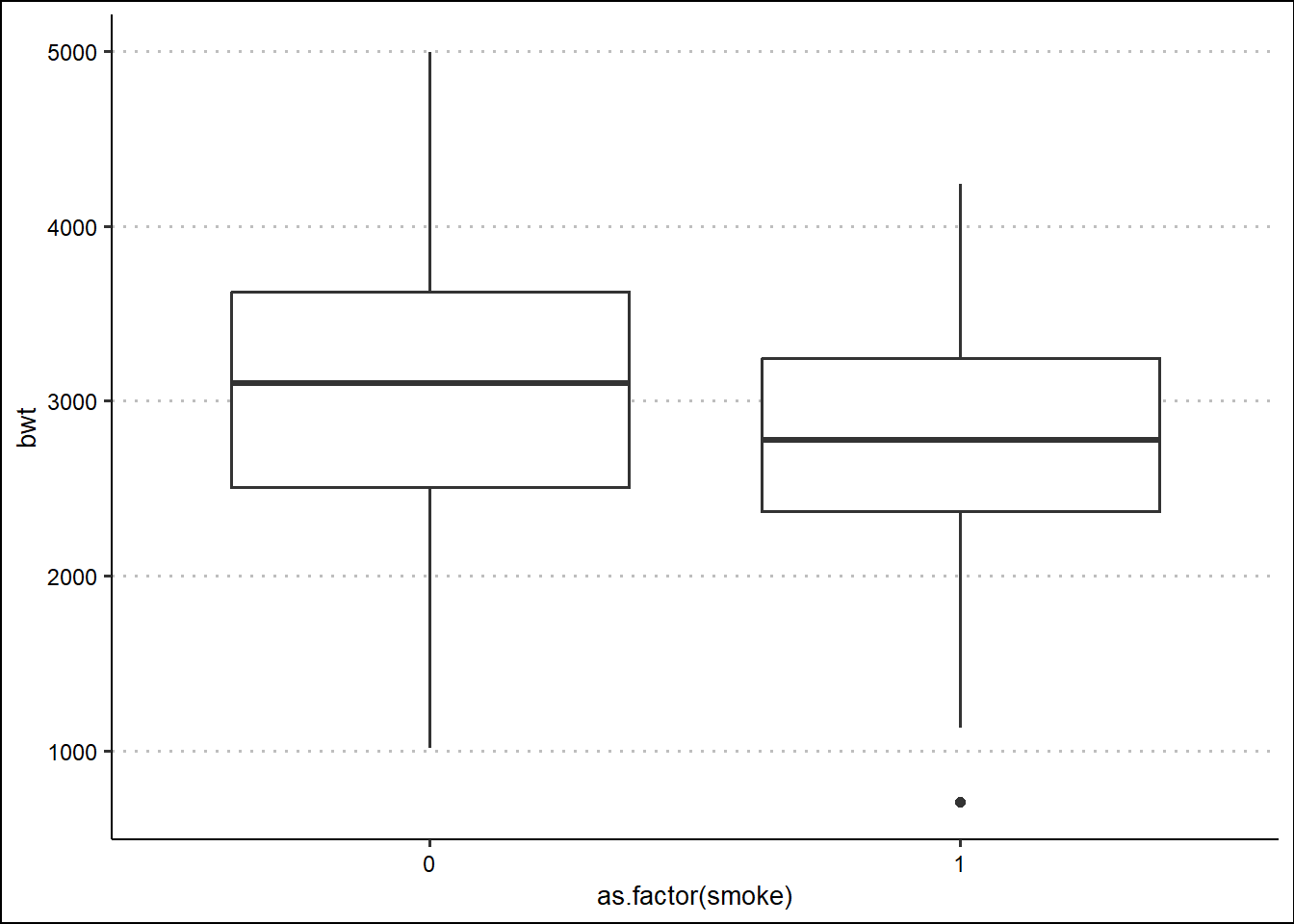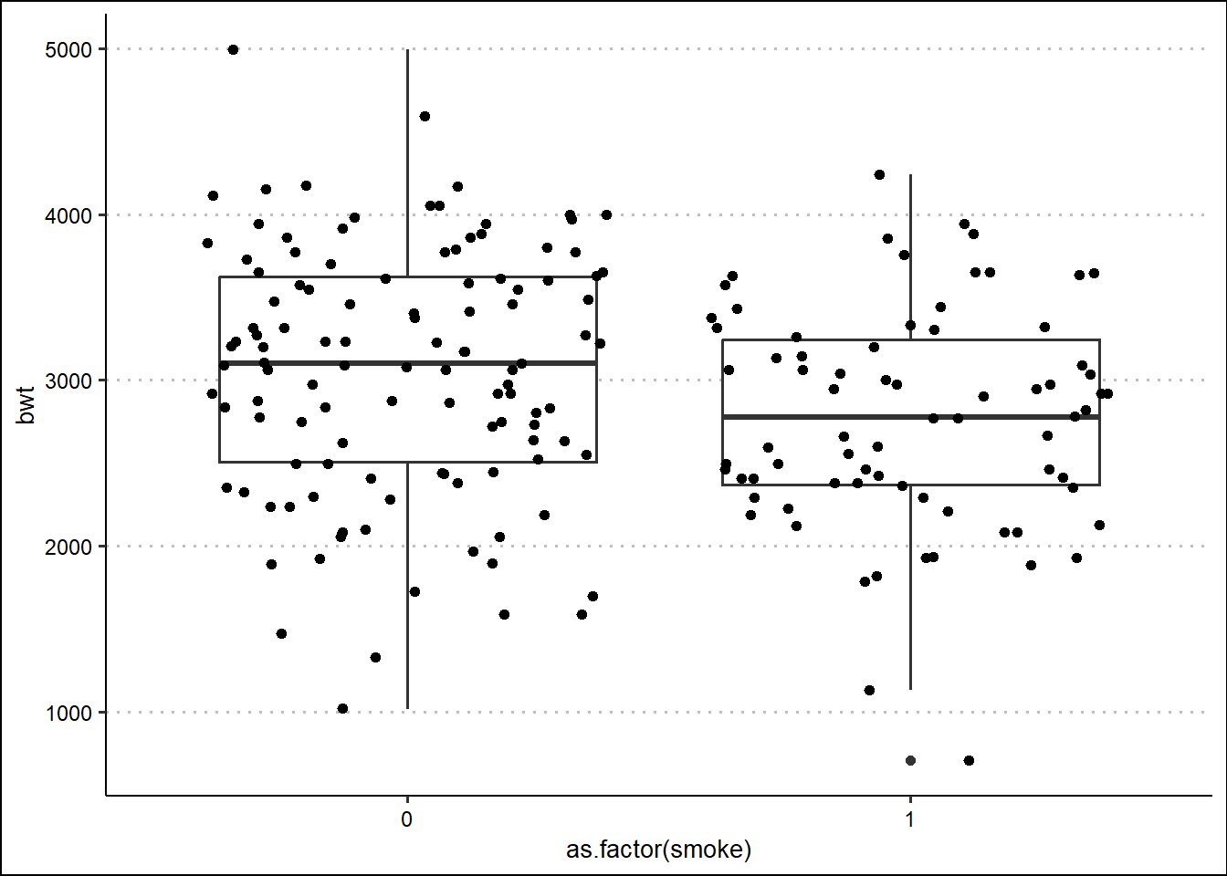 ggplot(birthwt, aes(x=as.factor(smoke) , y=bwt)) +