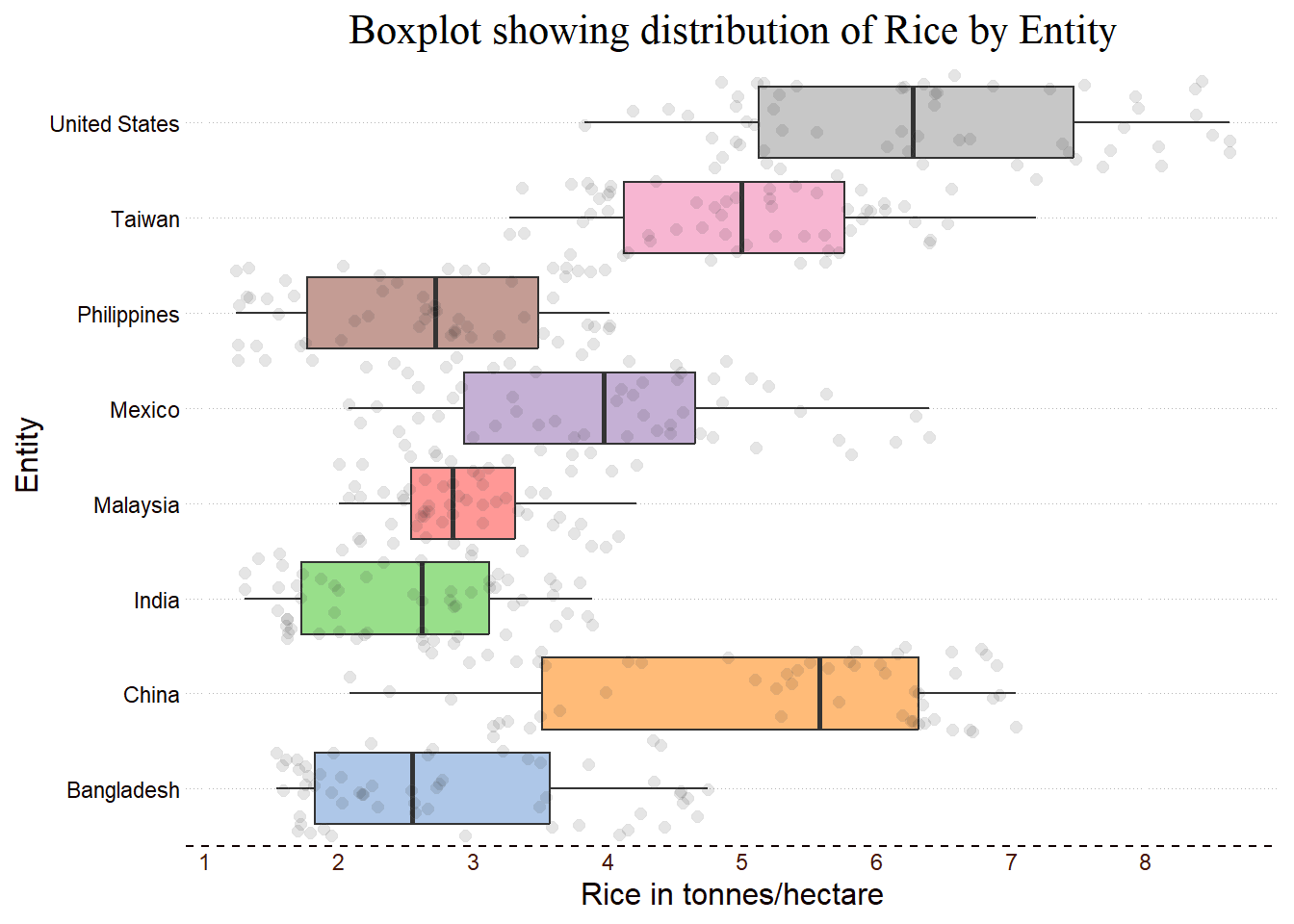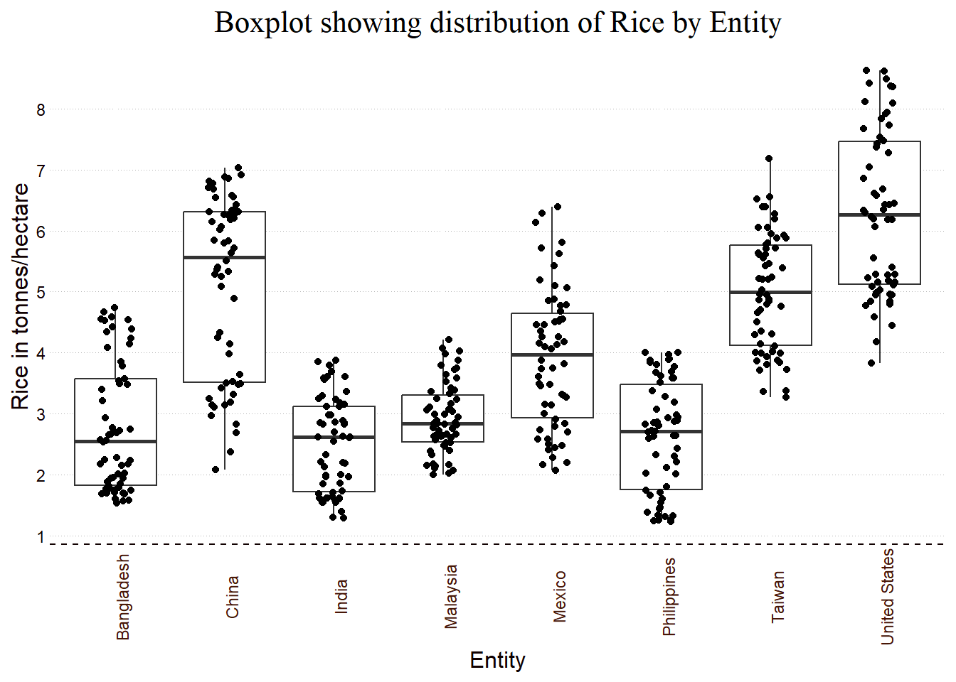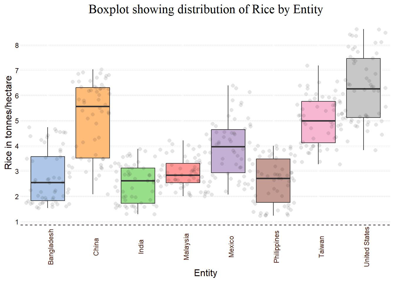 ggtitle("Boxplot showing distribution of Rice by Entity") +